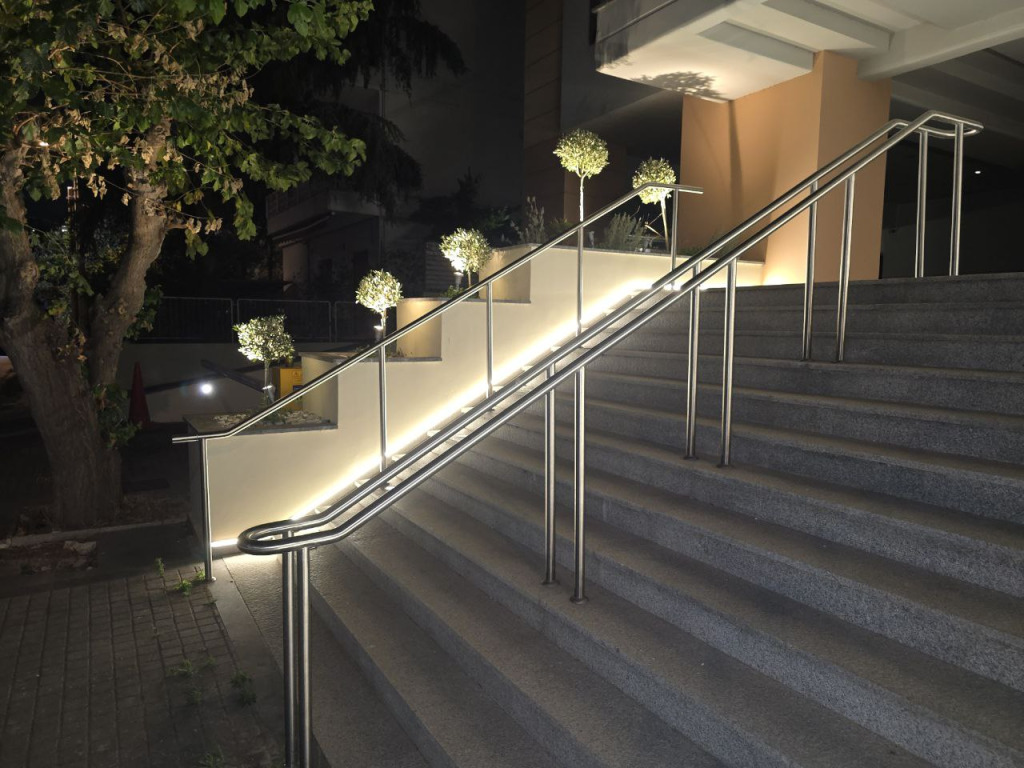 - Πρόσοψη Κτηρίου: Εφαρμόστηκε ένας προσεκτικά μελετημένος φωτισμός που τονίζει τις γραμμές και τον όγκο της πρόσοψης, προσδίδοντας στο κτήριο μια σύγχρονη και επιβλητική παρουσία. Χρησιμοποιήθηκαν φωτιστικά σώματα υψηλής απόδοσης με έμφαση στην ενεργειακή απόδοση και την αντοχή σε συνθήκες λειτουργίας εξωτερικού περιβάλλοντος.
